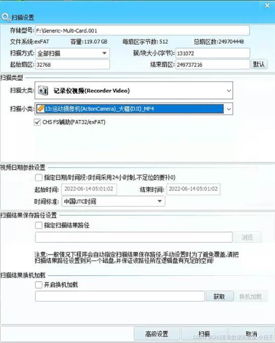 STEP1:选择要扫描的逻辑盘点击右键->扫描大类选择“记录仪”->扫描小类选择“大疆”->勾选CHS FS辅助功能,然后点击扫描。