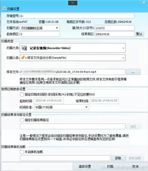 STEP1:选择要扫描的逻辑磁盘点击右键->扫描类型选择“仅扫描删除空间”->扫描大类选择“记录仪”->扫描小类选择“样本文件”,添加样本文件后点击“扫描”即可。