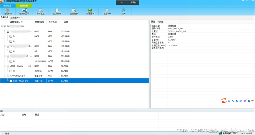 客户描述由于误操作导致存储设置被格式化,然后又拍摄了一条视频素材,之后就关机没有作过其它操作。存储卡还有57.7GB剩余空间(图1),卡中仅有一条20.1M的视频文件,需要恢复格式化之前所有的视频文件。