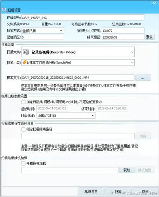STEP1:打开镜像文件选择exfat逻辑盘->扫描大类选择 “记录仪视频”->打开样本文件,然后点击右键“扫描”。