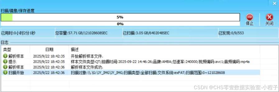 STEP2:等待扫描完成,可以看到程序已经解析出了样本文件的类型、拍摄时间、品牌、速率、编码等参数,程序会根据这些参数建立精确的视频模型,对于碎片定位和重组有极大的帮助。