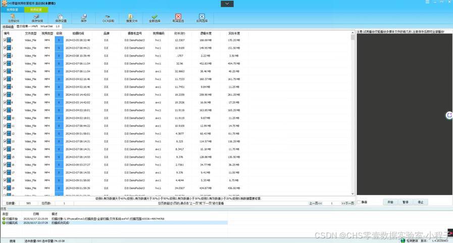 STEP3:扫描完成后直接查看数据,可以看到高级版已经列出了视频类型、级别、拍摄时间、摄像机型号、视频编码、时长、长度等参数,这些参数为查找数据提供了便利。可以看到程序成功找到了大约585条74.15GB左右的视频素材,经过和客户核对所有素材成功恢复,至此数据恢复工作完成!