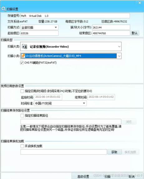 STEP1:选择要扫描的逻辑盘点击右键->扫描大类选择“记录仪”->扫描小类选择 “大疆”->勾选CHS FS辅助->扫描
