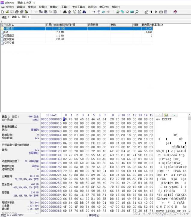 此存储卡由于需要被分了两个区,其中一个逻辑盘256GB用于Pocket3来存储视频文件,客户描述拍摄时由于操作出错导致把此逻辑盘误格式化,之后没有做其它操作。可以看到目前存储卡为空,有大约238GB剩余空间。
