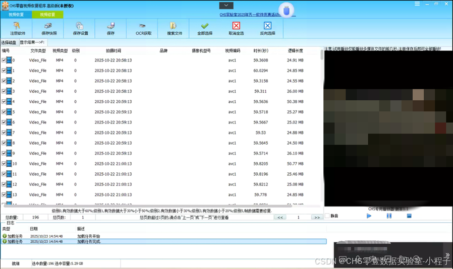 STEP3:扫描完成后直接查看数据,可以看到高级版已经列出了视频类型、级别、拍摄时间、摄像机型号、视频编码、时长、长度等参数,这些参数为查找数据提供了便利。经过对比成功恢复“开门杀”视频,至此恢复工作完成。(关于文件级别可以参考公众号或者博主的相关帖子)