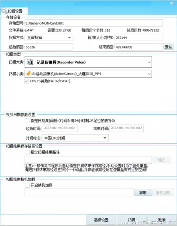 STEP1:选择要扫描的逻辑盘点击右键->扫描大类选择“记录仪”->扫描小类选择 “大疆”->勾选CHS FS辅助->扫描