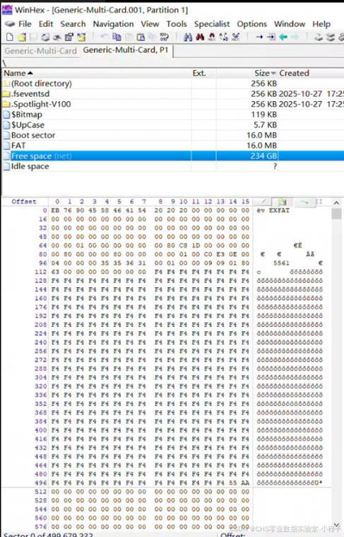 客户描述由于误操作导致存储卡被格式化,需要恢复卡上所有的视频文件。目前存储卡可用空间为234GB(图1),卡上空空如也没有文件。
