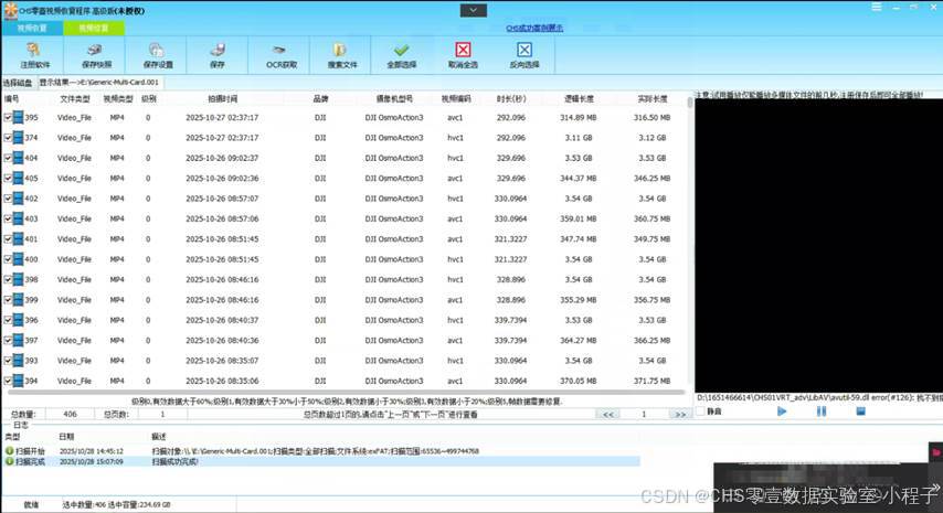 STEP3:扫描完成后直接查看数据,可以看到高级版已经列出了视频类型、级别、拍摄时间、摄像机型号、视频编码、时长、长度等参数,这些参数为查找数据提供了便利。可以看到程序成功找到了大约436条234GB左右的视频素材,经过和客户对比所有素材成功恢复,到此数据恢复工作完成!