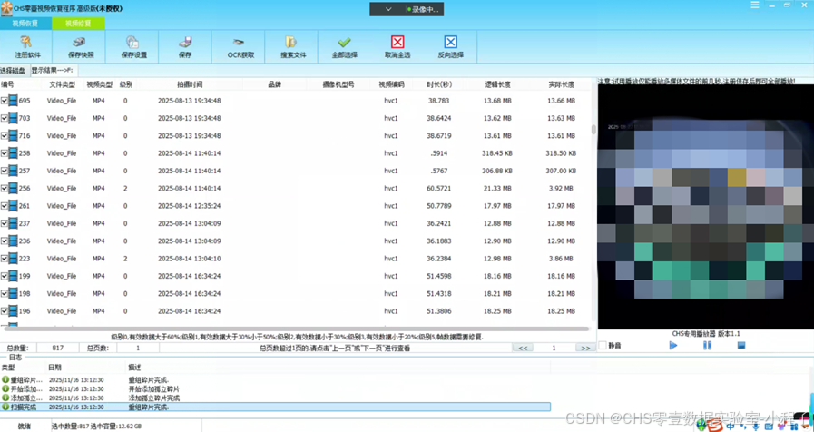 STEP3:扫描完成后直接查看数据,可以看到高级版已经列出了视频类型、级别、拍摄时间、摄像机型号、视频编码、时长、长度等参数,这些参数为查找数据提供了便利。经过对比程序共计恢复了817条视频文件约12.62GB基本上和U盘的可用空间吻合,至此恢复工作完成!(关于文件级别可以参考公众号或者博主的相关帖子)