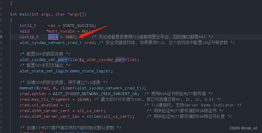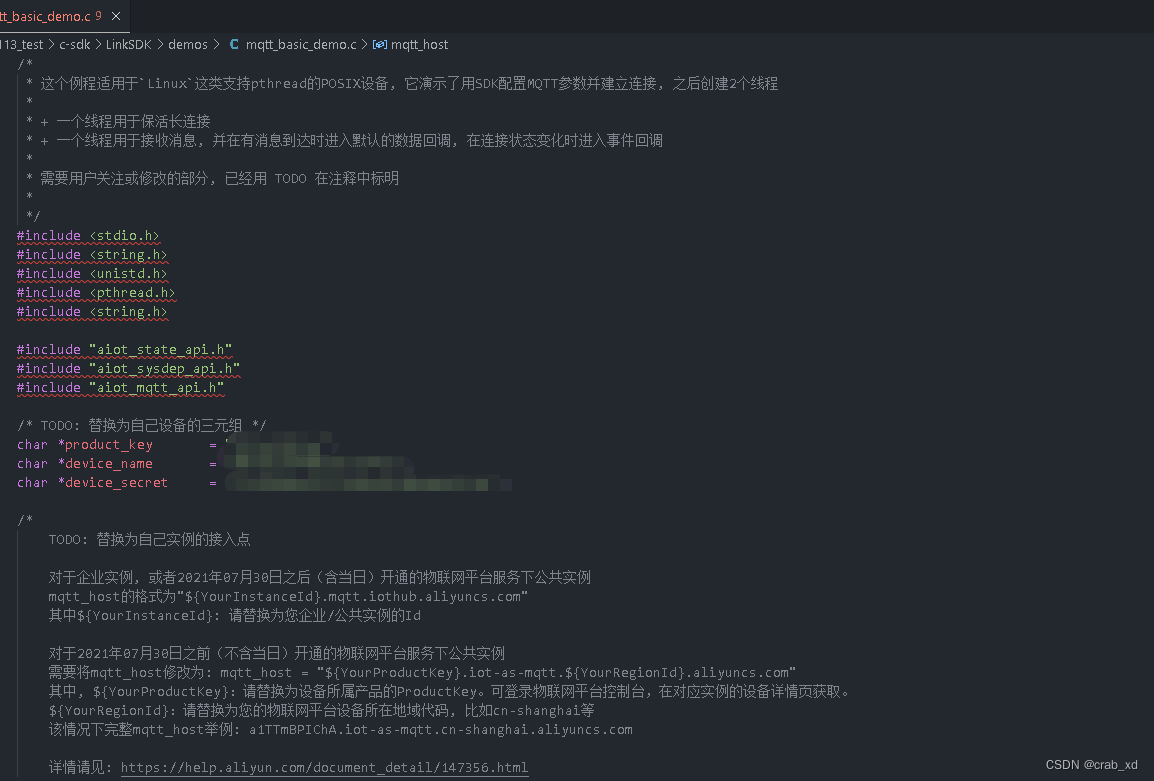 下面修改“mqtt_basic_demo.c”这个文件。打开它,修改三元组: