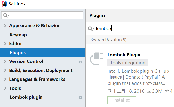 - IDE中安装插件,以IDEA为例: Settings -> Plugins -> 搜索Lombok Plugin,点击安装