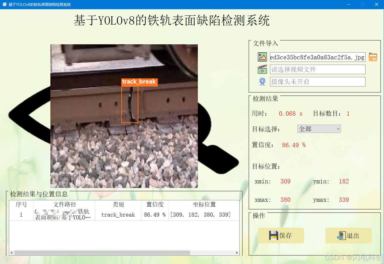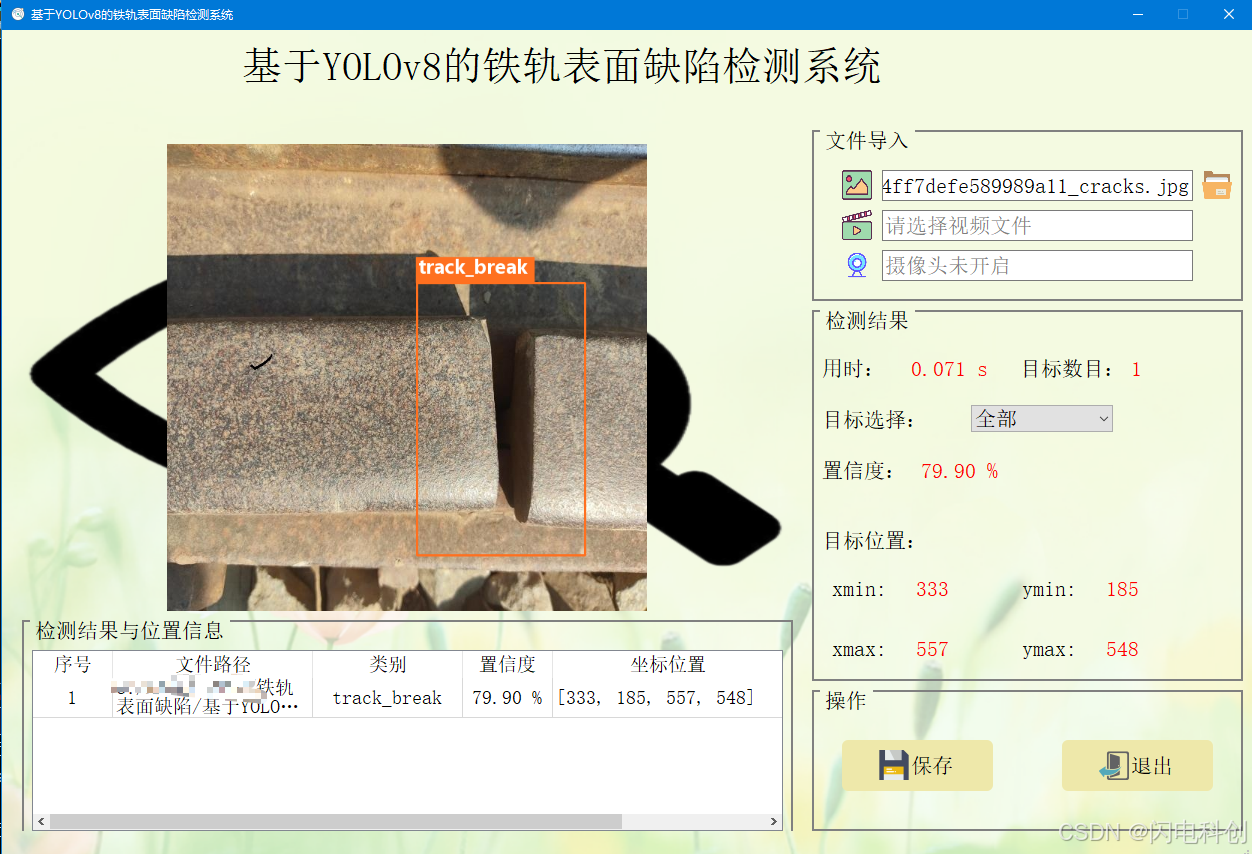 - 实时检测:训练完成后的YOLOv8模型可以实时对铁轨图像进行检测,识别出铁轨表面缺陷并进行分类。