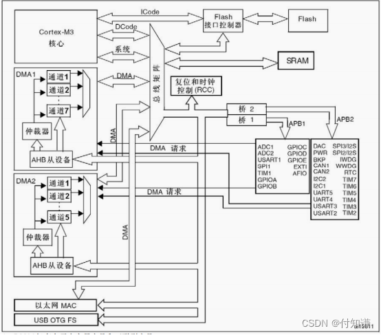 从图中可以看出共有两个DMA,为DMA1和DMA2,其中DMA1有7个通道,DMA2有5个通道,他们都挂接在AHB总线上,这就意味着使用他们需要使能AHB中的DMA时钟。