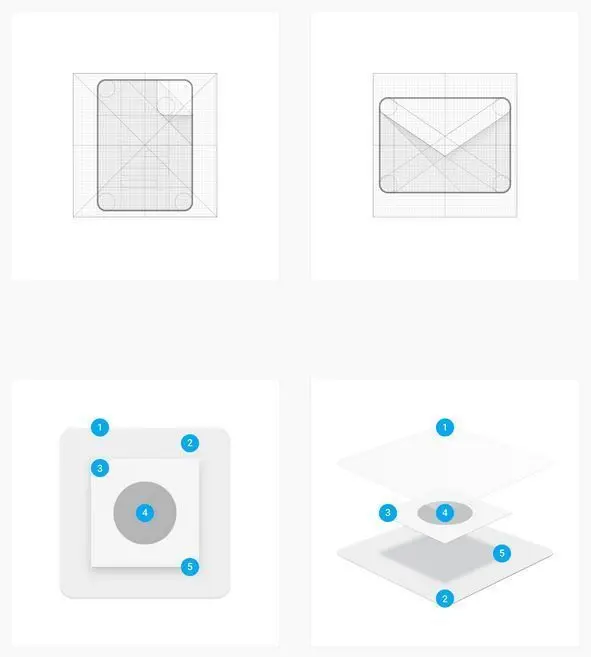 2. 应用图标上引入z轴分布时,每层不要超过1dp厚(160dpi屏幕上的1像素),仿佛是纸叠出来的,可以引入阴影加强层次关系