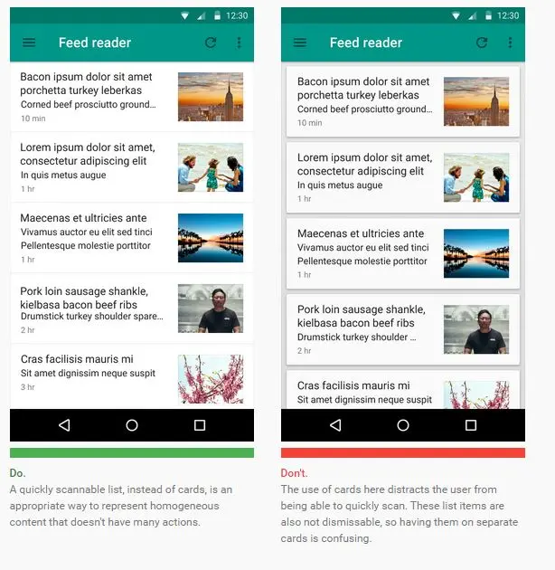 反之,单一的(比如图片库),主要供浏览的,没有太多对应动作的内容的罗列,并且设计上不能被滑动移除的信息流,做成列表会更合适,卡片会打断阅读,造成困惑,损害体验。