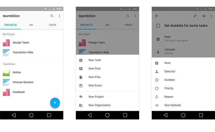 1. 与环境相容(context aware)的全局添加按钮,比如除了任务、分享、文件、日程四大固定项目之外,在不同的界面下,还会有额外的选项,比如在项目列表界面下会新增“新项目”选项,在具体的任务中,可以选择添加备注,执行人、截止日期等等……
