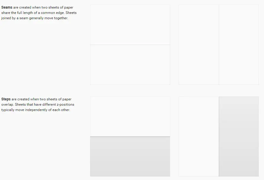 交接界面之间(比如导航栏、工具栏与内容部分)的独立性(比如是否会共同移动)不同,最好在z轴的高度层次上有体现,平边(seams)则连接两个共同移动的界面,仿佛一张纸推动着另一张纸移动。