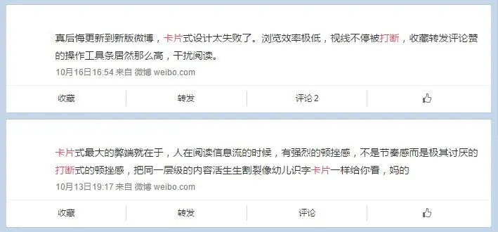 最后,一个有意思的例子:微博新改版的过程中使用卡片收到了很多吐槽,其实也是一件很无奈的事情,理论上来说每条微博有转赞评等行为,但如果大部分人的使用行为都只是浏览,则着重动作的卡片就会造成打扰。