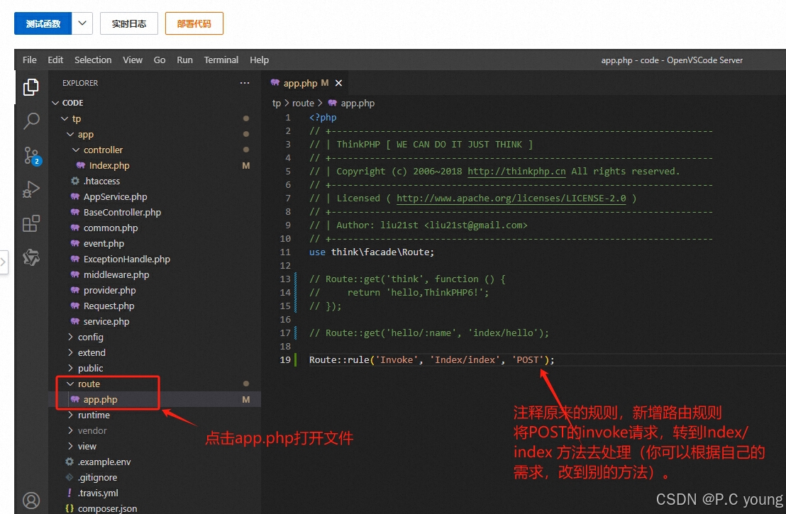 接下来就需要通过thinkphp的自定义路由,将此路径映射到app的默认首页入口。首先在webide里面打开左侧文件列表“route/app.php”,注释掉原来的路由规则,添加一个路由规则,将invoke请求转到 Index/index去处理。