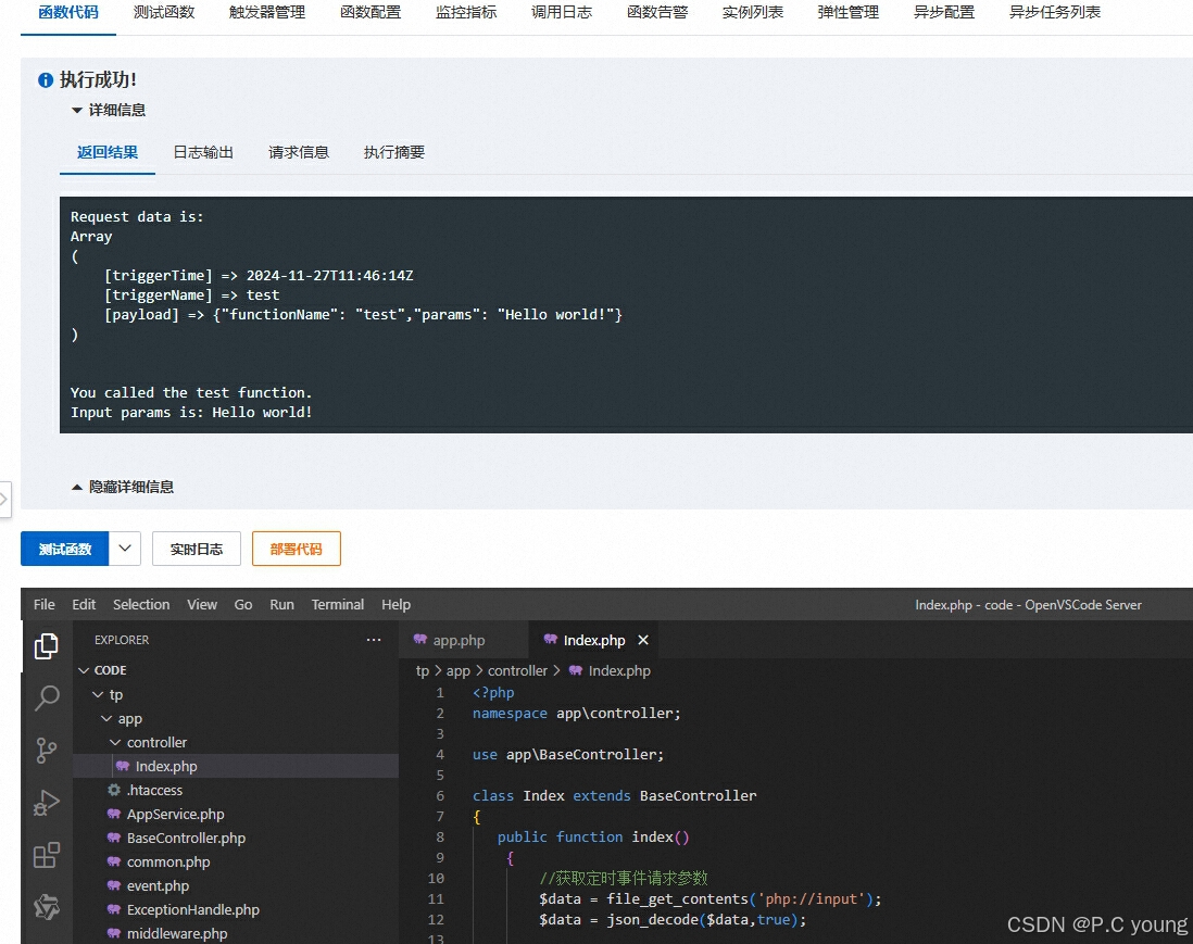 这句话的意思就是,执行函数时,只有一个唯一的请求入口路径: /invoke 携带POST请求参数过来,我们需要在函数里面实现这个接收方法。但是此时thinkphp的应用(app目录)里面并没有这个方法,且请求路径还没有控制器。此时测试函数,是会报错的。