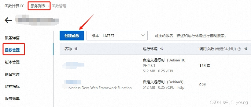 (1)、在阿里云函数计算控制台页面内,创建好服务之后,进入服务的“函数管理”功能页面。在这里“创建函数”。