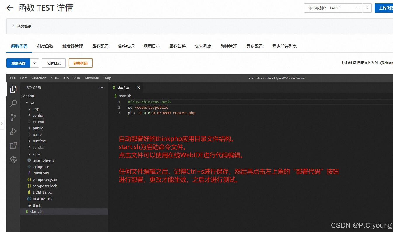 (1)、函数创建完成之后,即会进入到函数详情页面。基本的ThinkPHP代码已经部署好了。下图为基本的目录文件结构