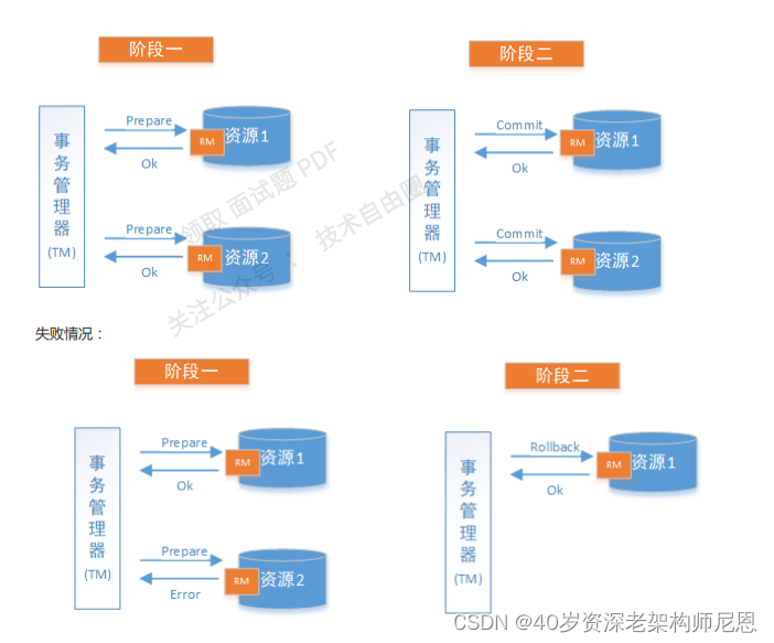分布式事务是指在分布式系统中,多个事务操作涉及到多个数据库或资源,需要保证这些事务操作要么全部成功,要么全部失败。2PC(Two-Phase Commit)是一种分布式事务协议,用于协调分布式事务的提交和回滚。其过程主要分为两个阶段: