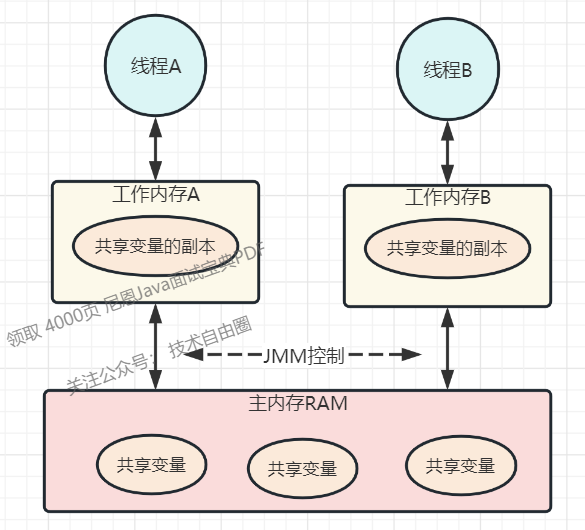 内存模型(Java Memory Model,简称 JMM ):定义了线程和主内存之间的抽象关系,即 JMM 定义了 JVM 在计算机内存(RAM)中的工作方式。