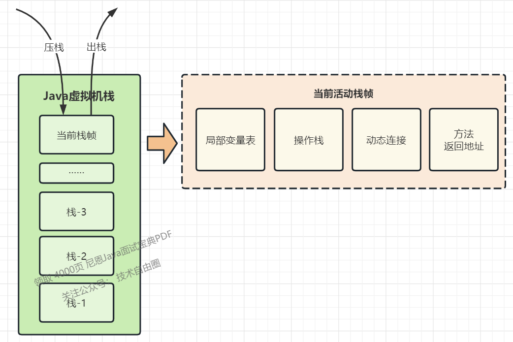 栈是一个先入后出(FILO-First In Last Out)的有序列表。在活动线程中,只有位于栈顶的栈帧才是有效的,称为当前栈帧。正在执行的方法称为当前方法,栈帧是方法运行的基本结构。在执行引擎运行时,所有指令都只能针对当前栈帧进行操作。