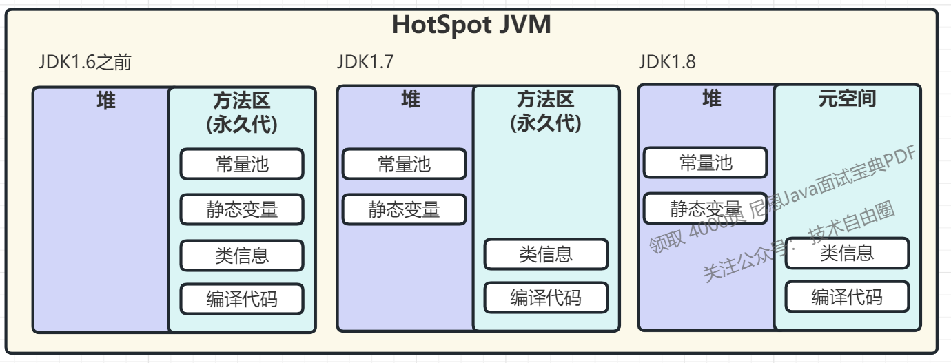 通过 JDK 1.8 之前与 JDK 1.8 之后的 JVM 运行时数据区域分布图对比,我们可以发现区别就是 1.8有一个元空间替代方法区。下文元空间章节介绍了为何替换方法区。