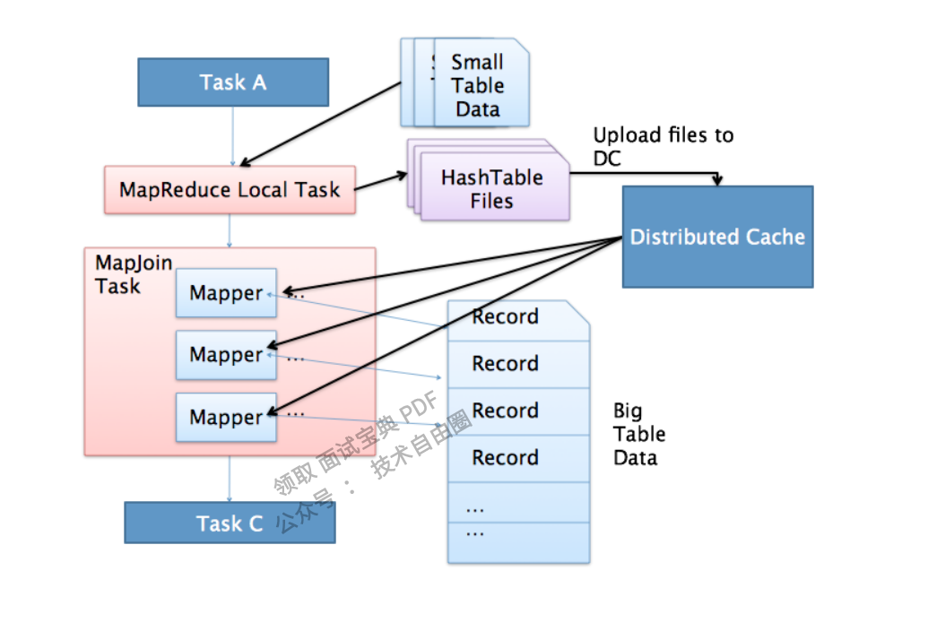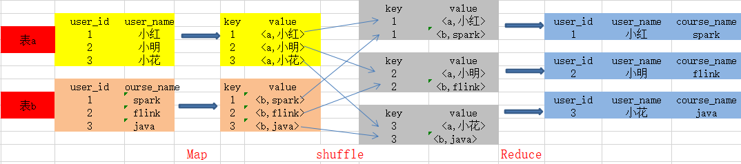 如果两张都是大表,那么采用联合key,联合key的第一个组成部分是join on中的公共字段,第二部分是一个flag,0代表表A,1代表表B,由此让Reduce区分客户信息和订单信息;在Mapper中同时处理两张表的信息,将join on公共字段相同的数据划分到同一个分区中,进而传递到一个Reduce中,然后在Reduce中实现聚合。