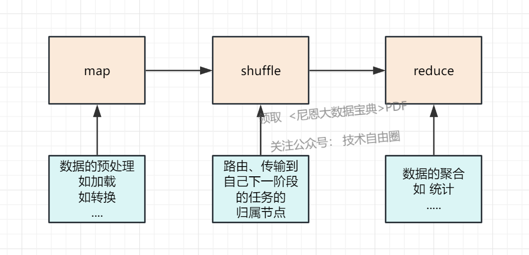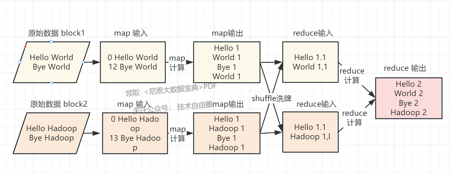那么,每个数据块的数据都是独立的,如果这些数据块需要进行关联计算怎么办?MapReduce 通过 shuffle洗牌 的动作去完成。