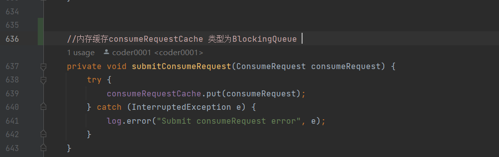 消费者代码中,通过循环,调用poll方法,不停地从 consumeRequestCache 拉取消息进行处理