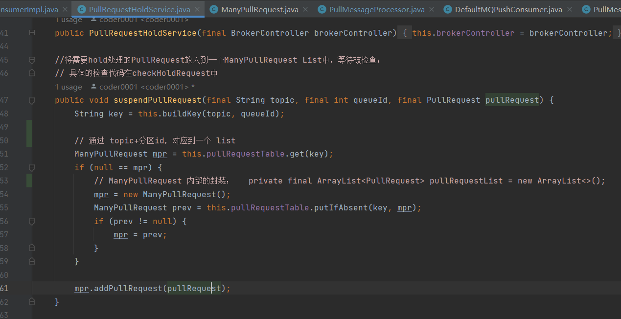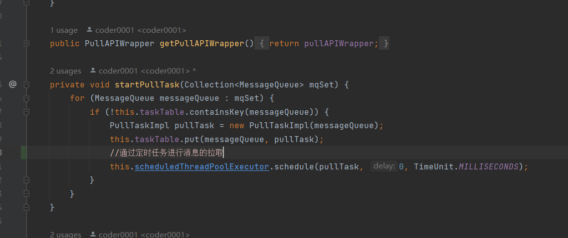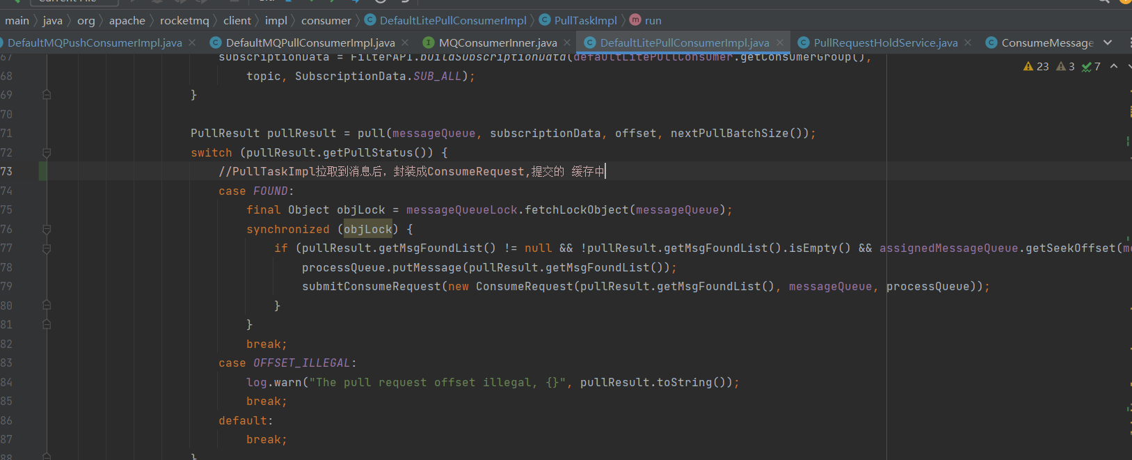 PullMessageService 把拉取请求,重新放进pullRequestQueue 队列, 大致的代码如下: