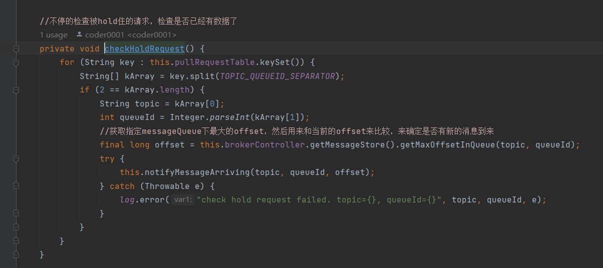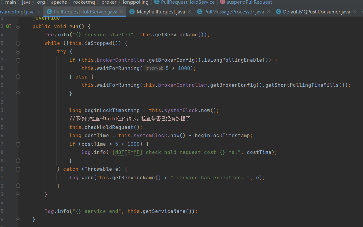 这个线程会每 5 秒从 pullRequestTable 取PullRequest请求,然后进行检查,看看是否有新的消息