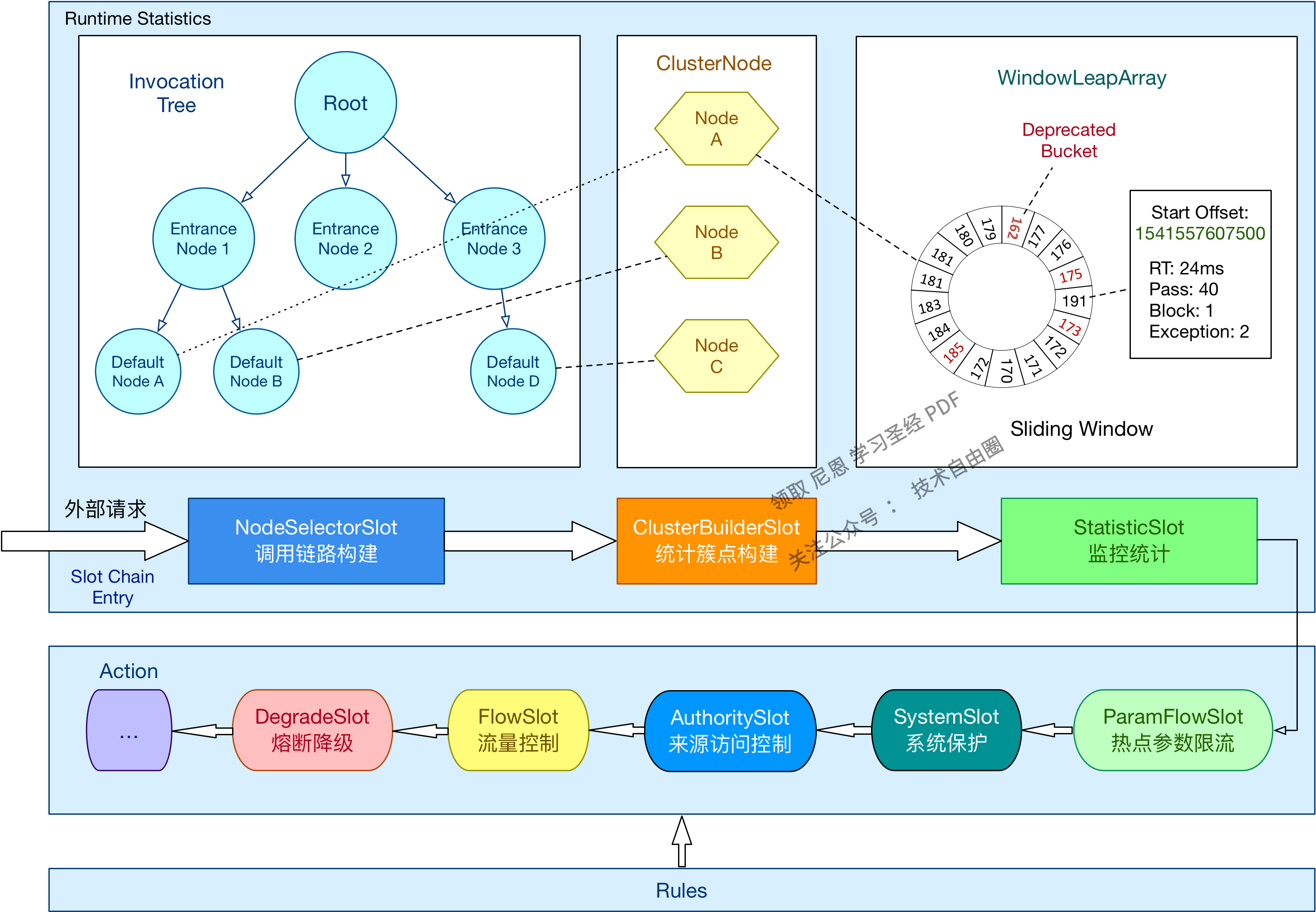 上图中的右上角就是滑动窗口的示意图,是 StatisticSlot 的具体实现。