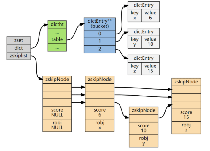 - 在比较时,不仅比较分数(相当于skiplist的key),还比较数据本身。在Redis的skiplist实现中,数据本身的内容唯一标识这份数据,而不是由key来唯一标识。另外,当多个元素分数相同的时候,还需要根据数据内容来进字典排序。