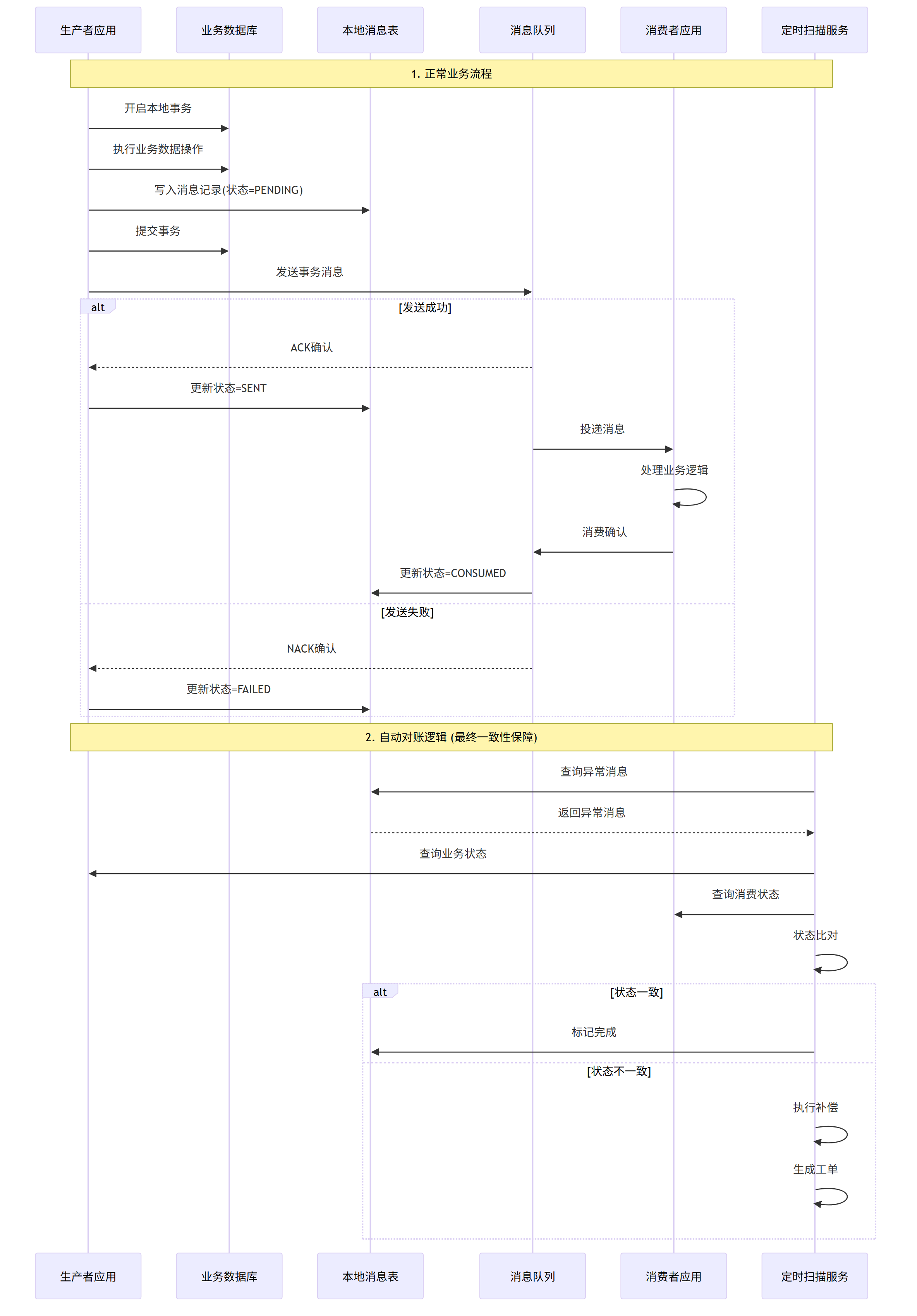 - 若 “Service A 成功 + Service B 成功”:更新本地消息对账表 “对账状态 = 已一致”“Service B 状态 = 已成功”,完成对账;