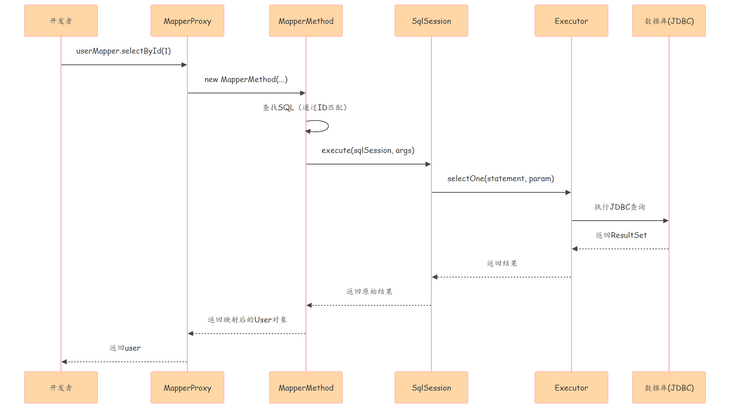 以下是使用 MyBatis 查询一条用户记录的核心流程:
