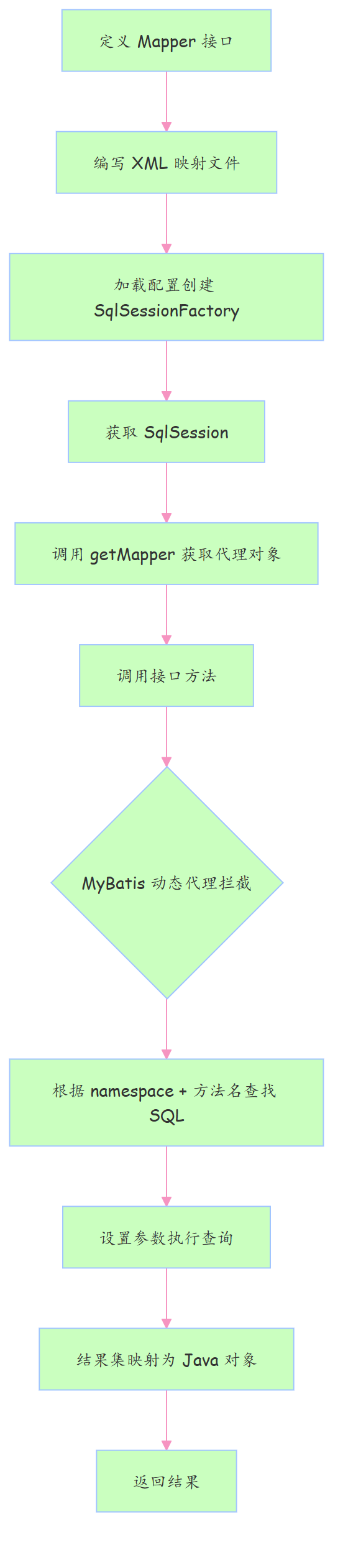 MyBatis 的核心机制: 通过 Java 动态代理为 Mapper 接口生成代理对象,结合 SQL 映射配置,实现接口调用自动转化为数据库操作。