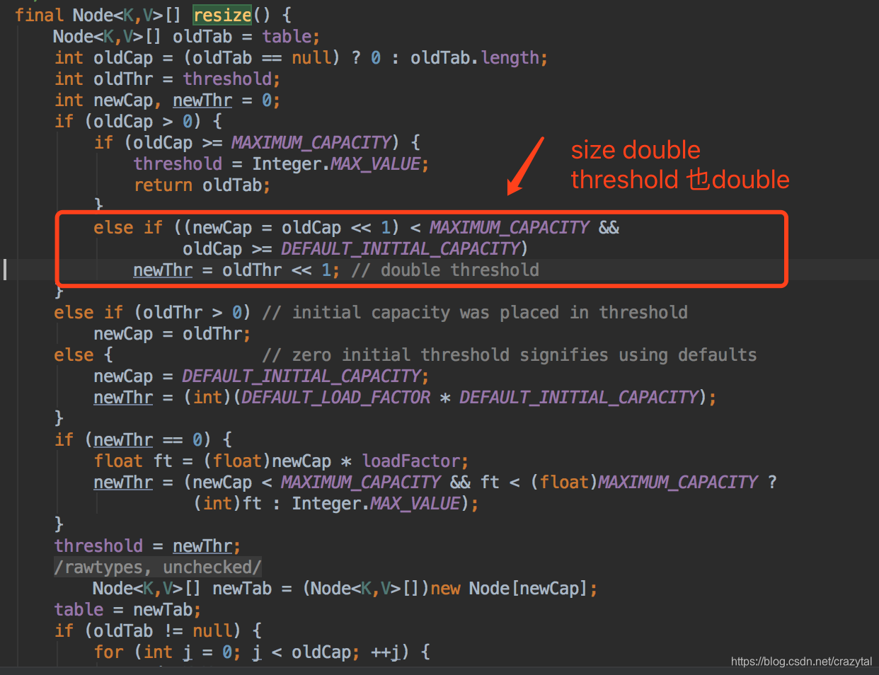 让我们来看看hashMap是如何进行扩容的 这里面用于判断的threshold的值为数组长度的0.75 初始值为12