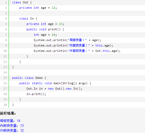 注意:①如果内部类没有与外部类同名的变量,在内部类中可以直接访问外部类的实例变量