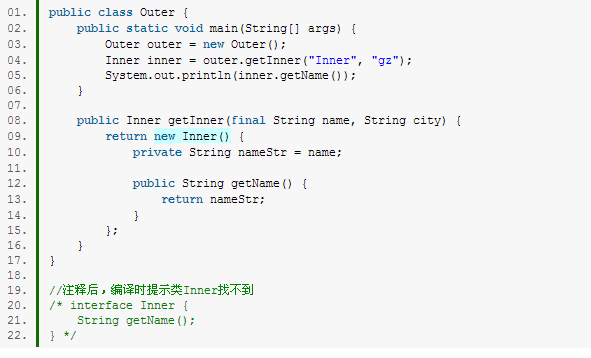 注意:①留意外部类的方法的形参,当所在的方法的形参需要被内部类里面使用时,该形参必须为final。这里可以看到形参name已经定义为final了,而形参city 没有被使用则不用定义为final。(具体原因比较复杂呢,需要了解java的编译机制,可以参考:http://android.blog.51cto.com/268543/384844/)