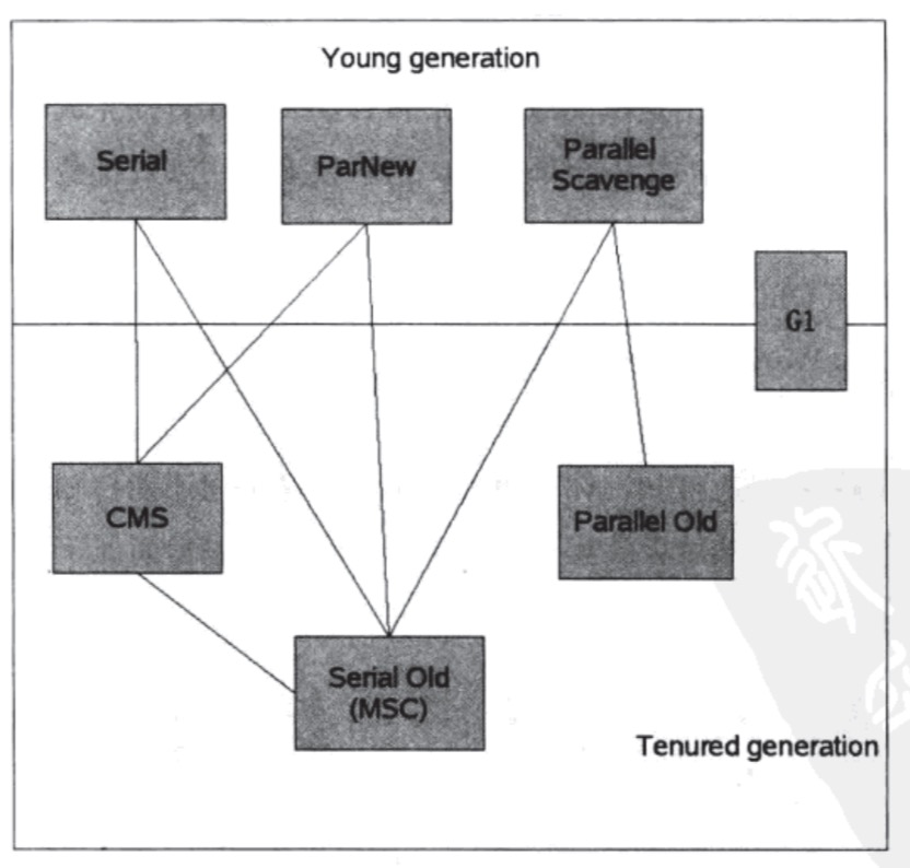 上图展示了7种不同分代的收集器,如果两个收集器之间存在连线,则他们可以搭配使用。