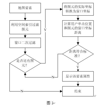 信息工具应该有一个选取策略,在注重信息点的地图上可以先遍历点,再遍历线,最后再遍历面,读者可以自行确定这种选取策略。地图要素经过空间索引和窗口两道过滤之后,遍历过滤之后的要素,计算这些要素与用户单击位置的窗口距离(一般为象素),与您制定的标准比较,如果符合标准则显示该要素的属性,循环结束。此种方法仅仅显示一个图元的属性,如果用户单击的位置下面具有多个图元那么只好显示第一个被遍历到的图元,读者可以尝试自己增加这种情况的处理,使得程序能够显示所有符合标准的图元属性。