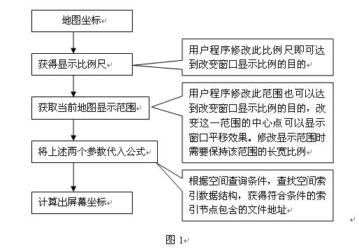 放大工具的实现主要是将显示比例尺缩小,GIS引擎自己就会将视图放大,反之则将视图缩小。前面的章节介绍过,地图要素读取之后,通过空间索引、MBR的过滤之后,需要绘制到窗口中,绘制之前需要进行一步地图实际坐标到窗口坐标的转换工作,这个转换过程使用的公式其中就有这个显示比例尺作为参数,只要将这个比例尺缩小,即可调用GIS引擎的方法来实现放大地图的功能。图1为地图坐标转屏幕坐标的流程。只要缩小步骤2中的显示比例尺或者等比例缩小步骤3中的显示范围,即可达到放大地图显示的目的,反之则是缩小工具的实现方式。修改步骤3中显示范围的中心点,即可达到平移地图的效果。