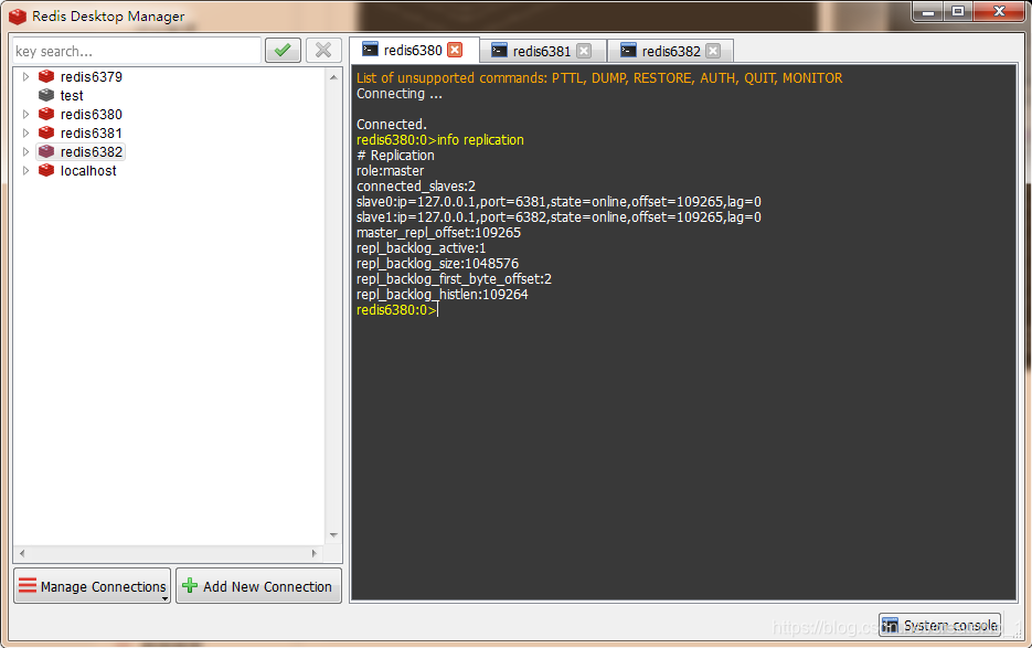上面的日志打印看出新的主服务是 6382 对应的 redis 服务,看不懂上面那个没关系,可以继续再 manager 查看 info: