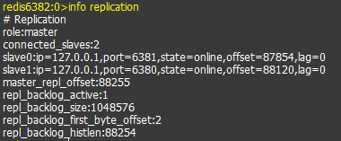 我们主服务是 6380 端口,可以通过 redisDisktopManager 工具,执行 info replication 命令查看实例信息,明显能看到,role 角色为 master,有两个 slave,如下: