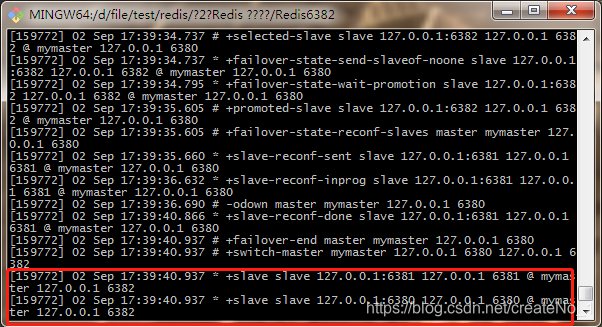上面可以看出 redis6380 变为了从服务,master 信息指向 6382,redis6381 依然为从服务,redis6382 依然为主服务。