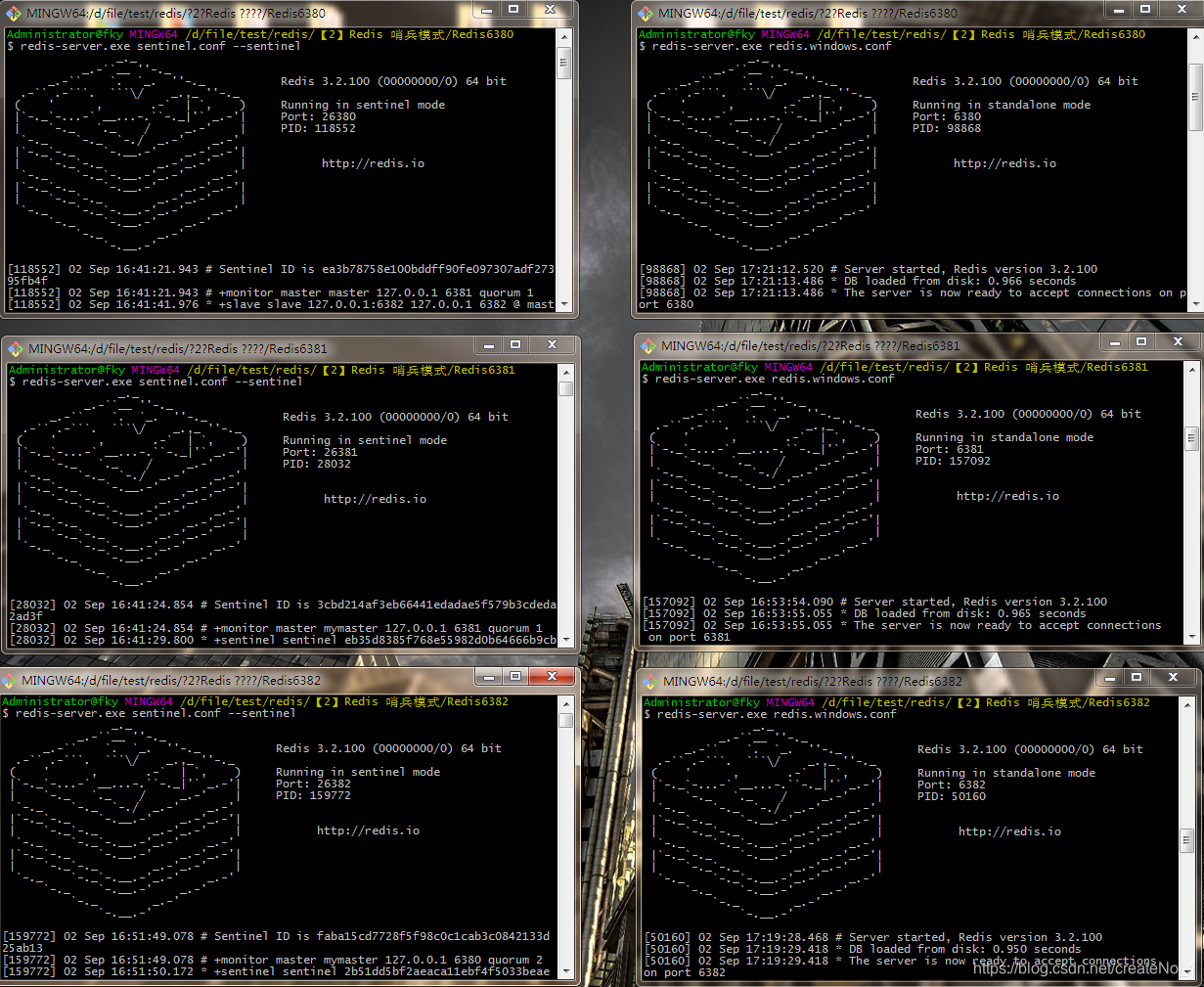 建议像下图那样先开六个窗口,右三个窗口启动三个端口对应的 Reids 服务,左 3 个窗口启动三个 sentinel 服务。